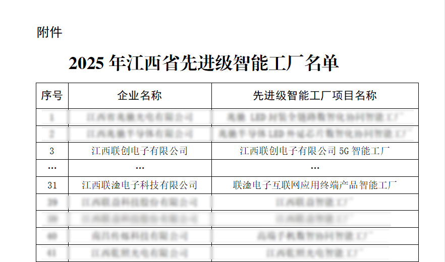 近日,江西省工业和信息化厅正式公布2025年江西省“先进级智能工厂”名单,186家企业入选。其中乐投官方网站/app/ios/安卓/在线/注册,、江西联淦电子科技有限公司2家联创电子系企业名列榜单。这标志着公司在智能制造领域的创新成果再次获得政府权威认可。